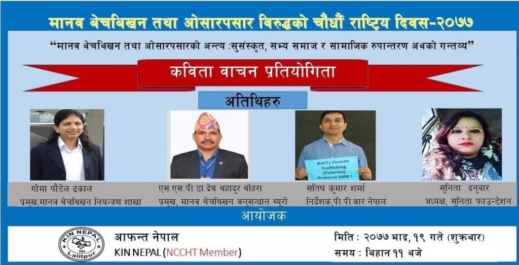 कृष्णानगर,कपिलवस्तु।मानव बेचबिखन तथा ओसारपसार विरुद्धको १४ औ राष्ट्रिय दिवसको अवसरमा विगत लामो समयदेखि मानव बेचबिखन विरुद्ध कृयाशिल रुपमा काम गर्दै आएको संस्था आफन्त नेपालले विभिन्न समयमा उद्धार गरी संरक्षणमा रहेका प्रभावित छोरीहरुको नेतृत्व बिकासका लागि कविता वाचन कार्यक्रम समापन गरेको छ। कार्यक्रममा आतिथ्यता तथा शुभकामना मन्तव्य दिनको लागि बिभिन्न सरोकारवाला निकायहरुको सहभागिता रहेको थियो ।