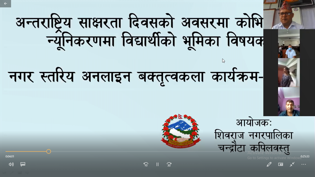 चन्द्रौटा शिवराज नगरपालिका अन्तरगत संचालित माध्यमिक बिद्यालयहरु विच अन्तराष्ट्रिय साक्षरता दिवस, २०७७ को अवसरमा “कोभिड–१९ न्यूनिकरणमा बिद्यार्थीको भूमिका” विषयक नगर स्तरीय बक्तृत्वकलाको आयोजना गरिएको शिवराज नगरपालिकाका शिक्षा प्रमुख उप सचिव लोकराज पन्थीले बताए । अनलाइन कक्षालाई समयमा सुचारु र व्यवस्थापनमा गर्न शिवराज नगरपालिकाका सुचना प्रविधि अधिकृत दिपक पौडेल र कम्पुटर अपरेटर प्रकाश वि क.ले प्रावधिक सहयोग गरेका थिए ।