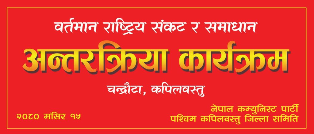 कपिलवस्तुकाे शिवराज नगरपालिका-५, चन्द्राैटामा नेपाल कम्युनिष्ट पार्टी (विप्लव) को आयोजनामा हुने भएको छ । देशको वार्तमान राजनितिक संकट र समाधानको विषयमा बृहत अन्तरक्रिया कार्यक्रम हुने पार्टीका पश्चिम कपिलवस्तुका सचिव बिनोद लुइटेल (पावेल सी) ले जानकारी दिनुभयो ।